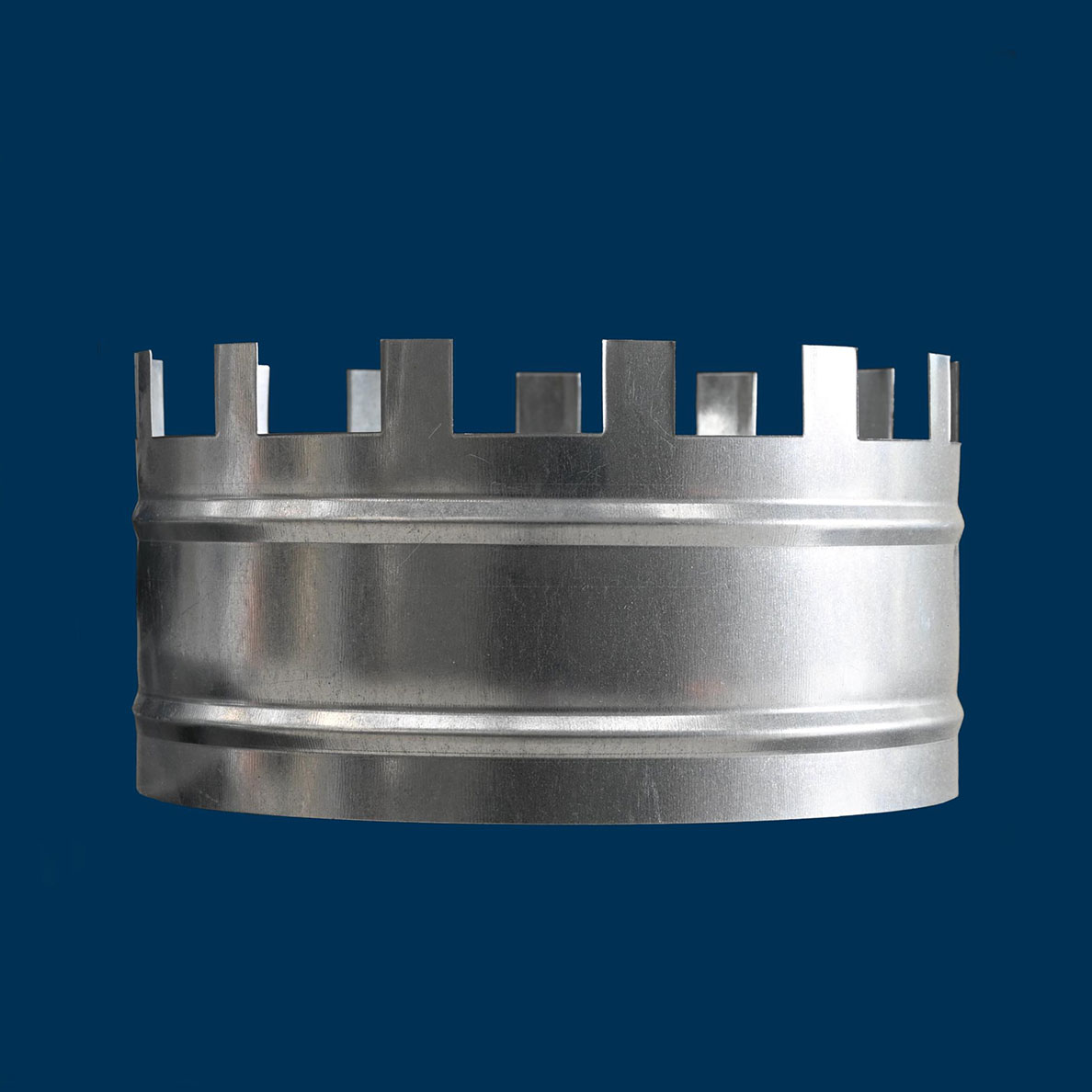 Elemento de unión mediante mútiples pestañas metálicas para unir un conducto de fibra de vidrio y un conducto flexible.